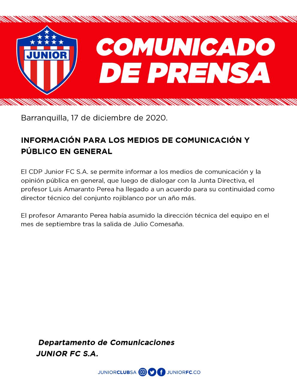 El técnico antioqueño Luis Amaranto Perea renovó su vínculo contractual con el Junior durante una temporada más, hasta diciembre de 2021, luego de asumir el cargo en septiembre de este año.