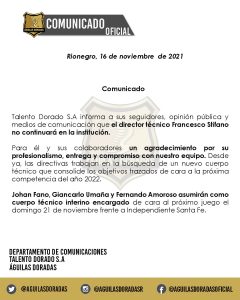 El club publicó el siguiente comunicado: “Talento Dorado S.A informa a sus seguidores, opinión pública y medios de comunicación que el director técnico Francesco Stifano no continuará en la institución”.