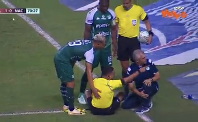 En el estadio de Palmaseca, Deportivo Cali iba ganando el partido frente a Nacional cuando al minuto 70 el juez de línea fue agredido desde una de las tribunas, al recibir un impacto con una botella.