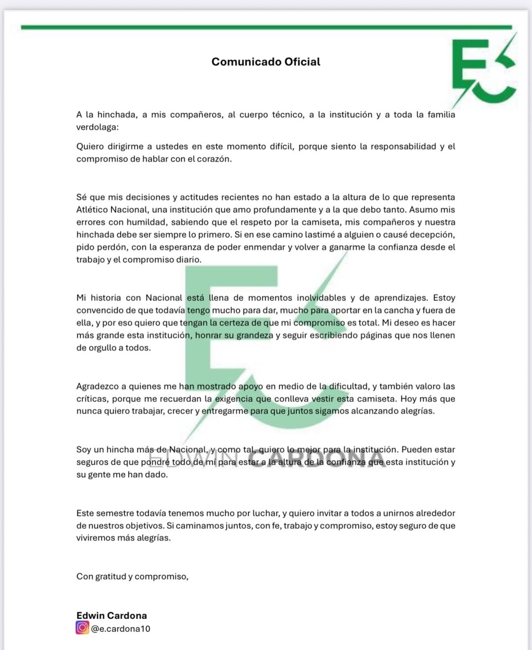 El volante Edwin Cardona hizo una publicación en su cuenta de Instagram en la que en un extenso texto ofreció disculpas a la afición, sus compañeros y dirigentes de Atlético Nacional por sus recientes actuaciones y actitudes, las cuales reconoció no han estado a la altura de lo que representa el club.