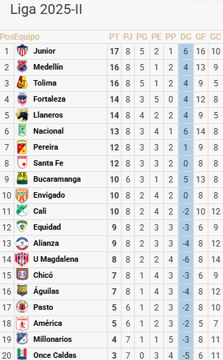 Pese al tropiezo de Junior en Bogotá, el equipo continúa líder de la Liga BetPlay con 17 puntos, escoltado por Medellín y Tolima con 16. Fortaleza y Llaneros sorprenden tras ubicarse en zona parcial de clasificación, mientras que Once Caldas (20), Millonarios (19), América de Cali (18) y Deportivo Cali (11), que son los clubes llamados grandes del país, tendrán que remar contra la corriente para no quedarse por fuera de los cuadrangulares finales, considerando que restan 12 fechas para que finalice la primera fase del torneo.